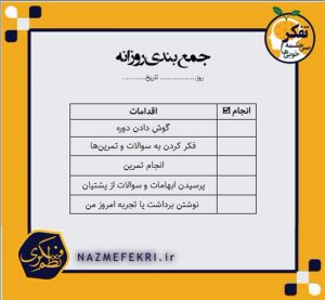 این دوره براساس یک زمانبندی ۹ روزه تدوین شده است. سعی کنید این چک لیست را در طول روز جلوی دید خودتان بگذارید و آخر شب تکمیل کنید. هدف از این چکلیست نظم گرفتن روال دوره و کمک به محاسبه خودتان است.